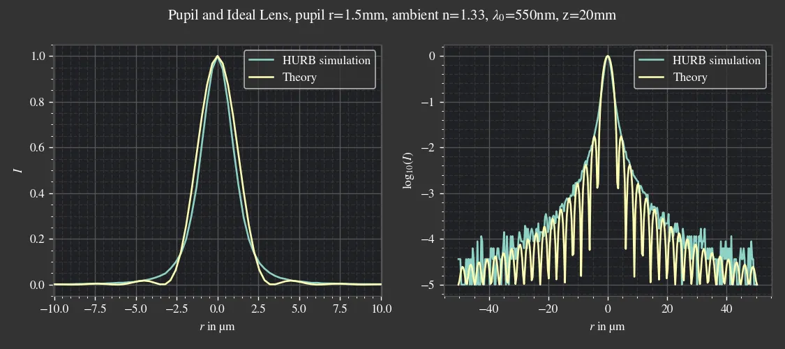 Fig. 5.16 Comparison of HURB and the theoretical curve for the focus profile of an ideal lens behind a pupil.¶