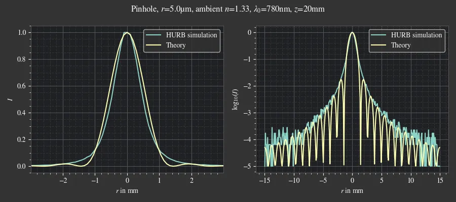 Fig. 5.15 Comparison of HURB and the theoretical curve for the far-field diffraction of a pinhole.¶