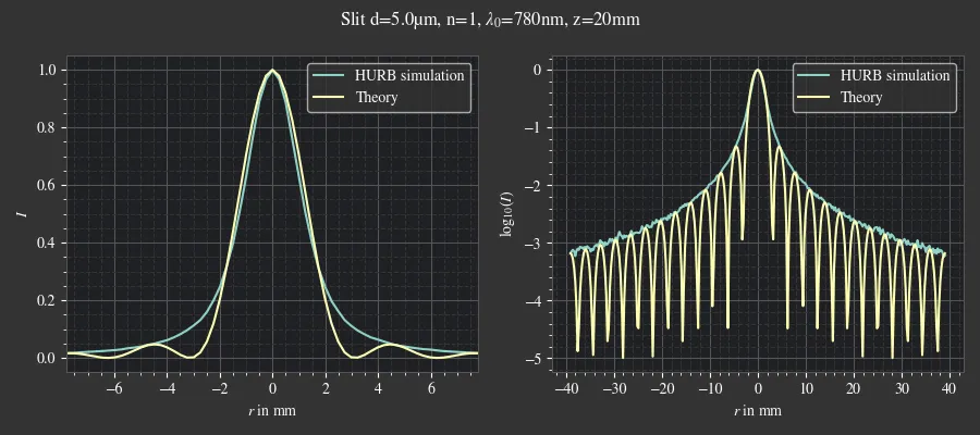 Fig. 5.14 Comparison of HURB and the theoretical curve for the far field diffraction of a slit.¶